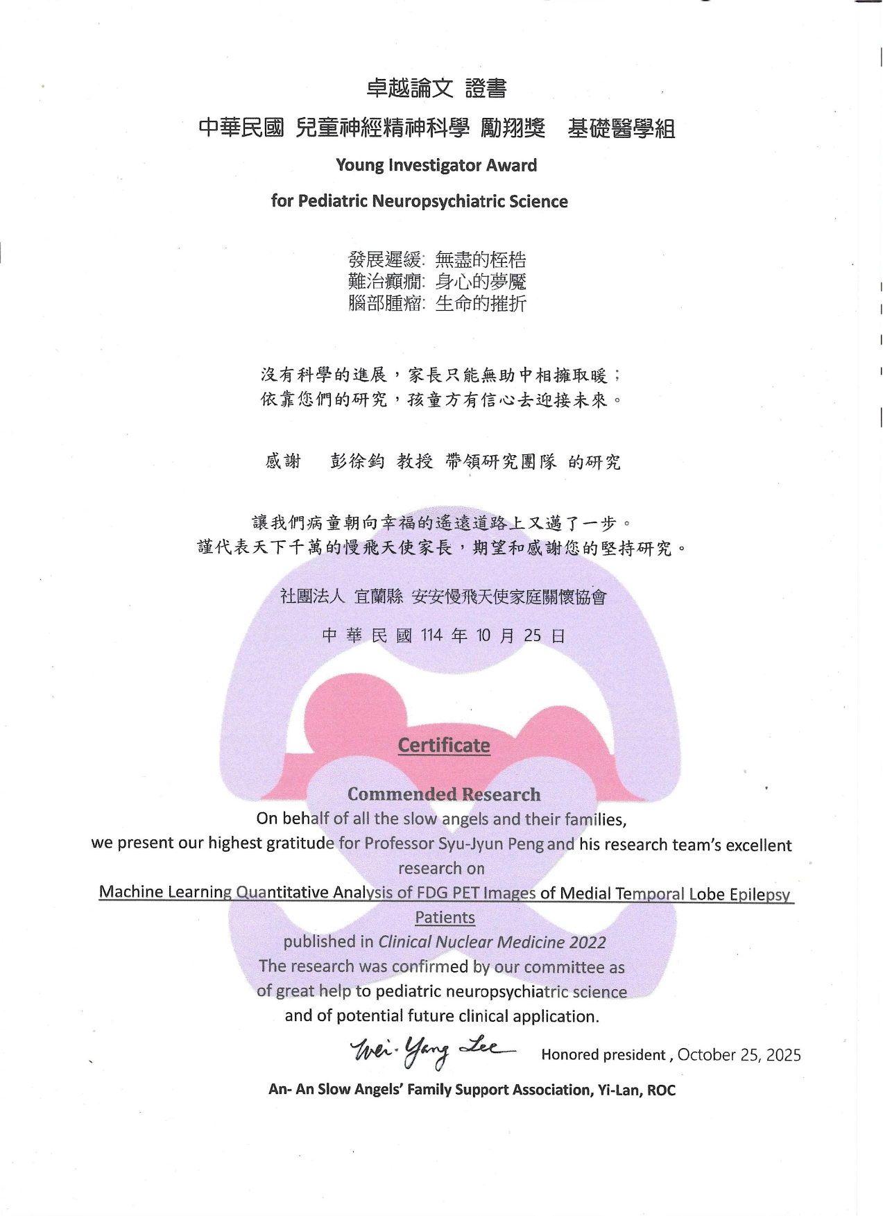 2025/11/25【恭賀】本專班彭徐鈞主任榮獲中華民國 兒童神經精神科學 勵翔獎 基礎醫學組